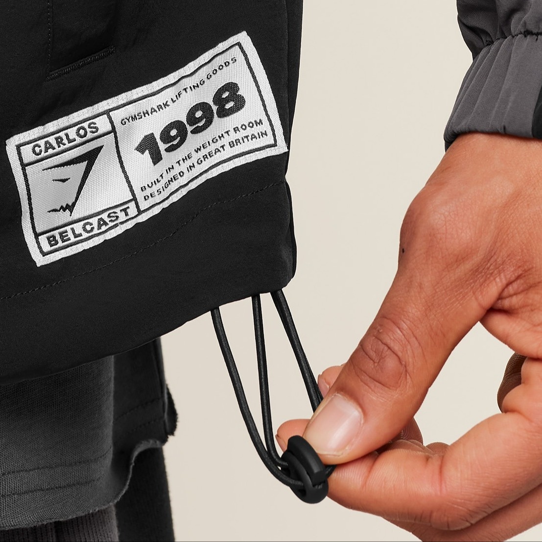 Designed for easy layering with an oversized fit, featuring contrast panels, a high neck to lock in warmth, a bungee hem for a custom shape, popper pockets, and an exclusive Carlos Belcast patch.